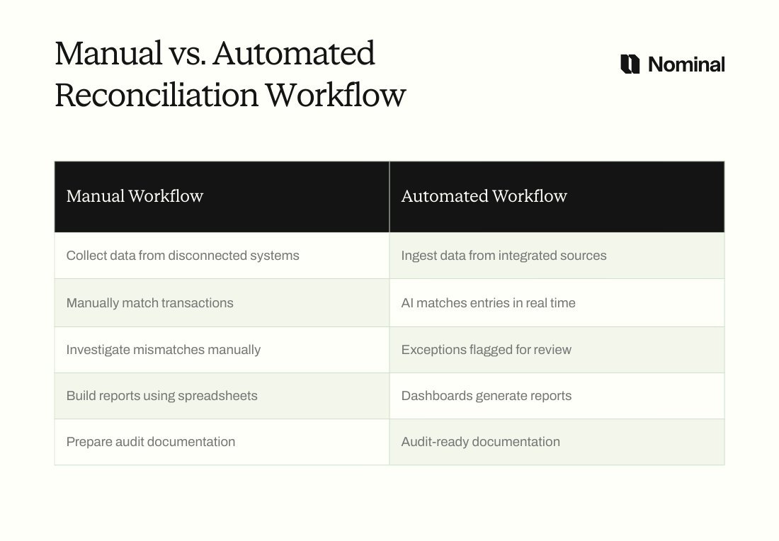 When comparing manual and automated reconciliation, the differences across speed, accuracy, and visibility are striking.